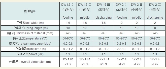 注: 1.将上表中同一规格的网带干燥机加料台,中间台,出料台三台串联使用,保证物料脱水干燥生产工艺要求.显著提高产量,有效保证产品品质。