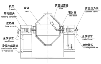 SZG系列双锥回转真空干燥机机体为双锥形的回转罐体,内胆采用不锈钢或碳钢搪玻璃(工业搪瓷)制成。夹套通入蒸气或热水,对内胆加温,热量通过内胆壁传导至湿物料,使湿物料中的水分气化,水气不断通过抽气管被抽走,罐体内处于真空状态,加快了物料干燥速率。罐体低速回转,物料不断上下,内外翻动更换受热面,最终达到均匀干燥目的。