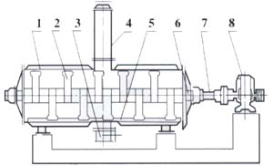 | 设备结构: 真空耙式干燥机的主要部件: 1.壳体 2.耙齿 3.出料装置 4.加料装置 5.粉碎棒 6.密封装置 7.搅拌轴 8.传动装置 |